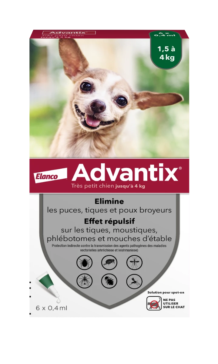 Les pipettes Advantix sont un antiparasitaire pour chien offrant une triple protection contre les tiques, les puces, les moustiques (phlébotomes). Grâce à l’action synergique de deux principes actifs.