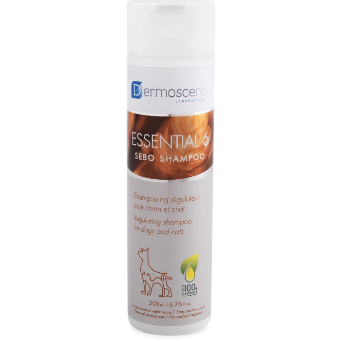 Essential 6® Sebo Shampoo est un shampooing sébo-régulateur apportant une réponse efficace aux déséquilibres cutanés (aussi appelés désordres ou troubles kérato-séborrhéiques) et à leurs conséquences : poils ternes, cassants, pelage sec ou gras, mauvaises odeurs… Sans parfum ajouté, sa formule concentrée riche en acides gras essentiels (oméga 6 et 3) extraits de plantes contient la même synergie d’huiles essentielles qu’Essential 6 spot-on plus l’huile de niaouli. Spécifiquement conçu pour les chiens et les chats (pH physiologique), Essential 6® Sebo Shampoo a pour but de :
