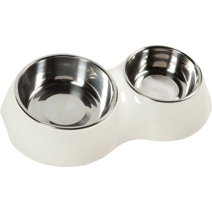 Ce plateau duo est idéal pour nourrir et offrir de l’eau potable à votre chien ou votre chat. Ces bols sont fabriqués en acier inoxydable et peuvent être facilement retirés pour être nettoyés. La gamelle double est doté d’une face inférieure antidérapante et peut être facilement ramassée grâce à l’encoche sur le côté.
