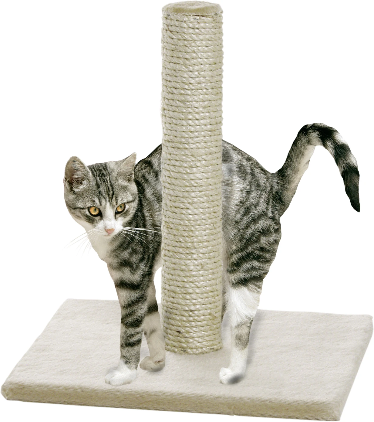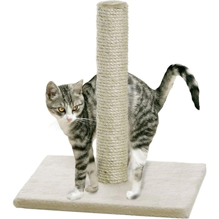 Petit griffoir avec base en peluche et poteau en sisal pour que votre chat puisse s’étirer et faire ses griffes.