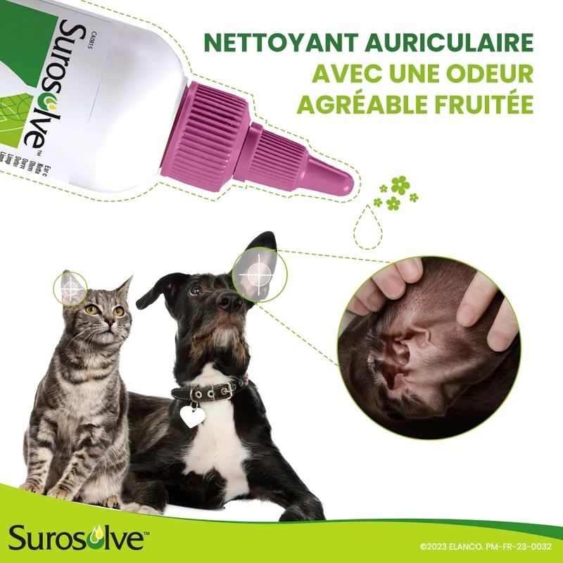Surosolve est une lotion nettoyante auriculaire qui assure la propreté et l’hygiène des oreilles de vos chiens et de vos chats.