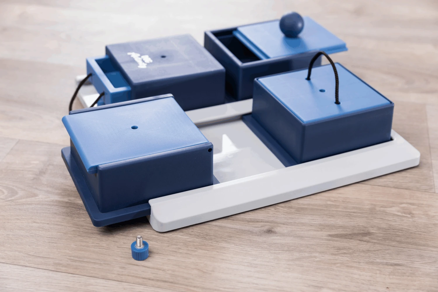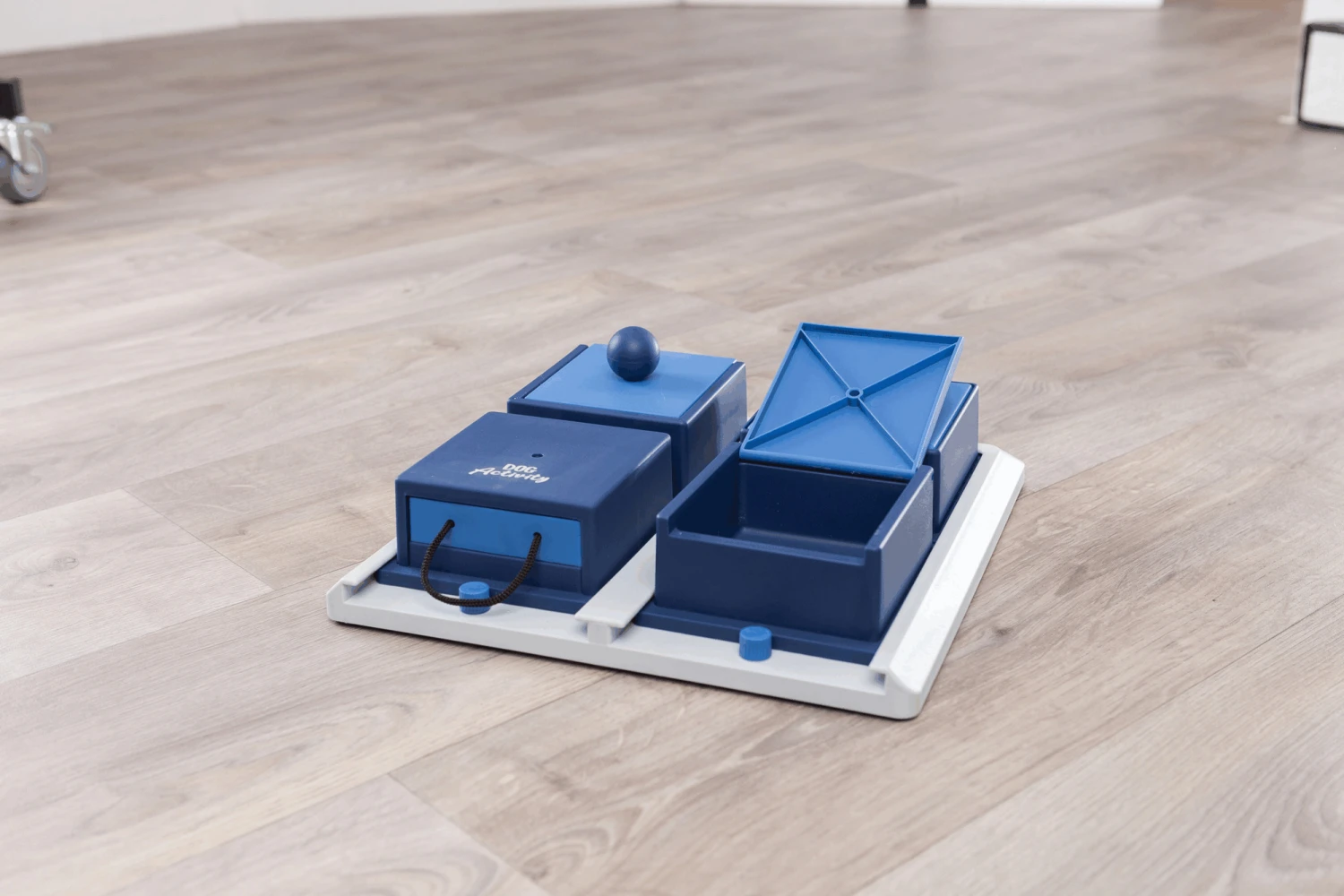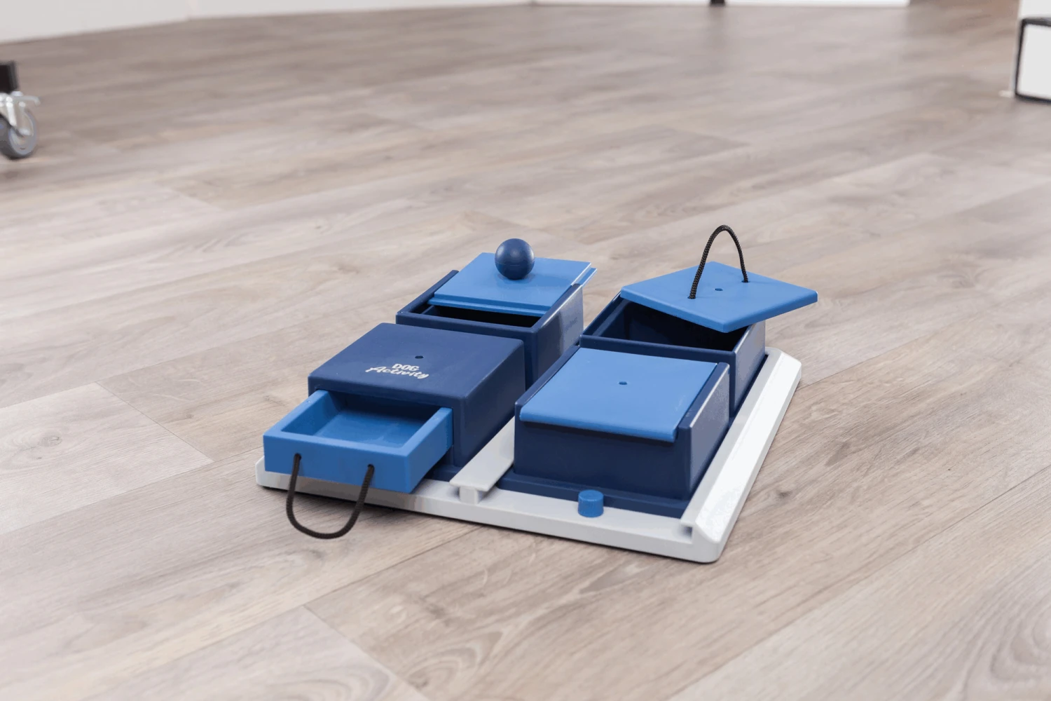 Cachez des croquettes ou des friandises dans les quatre plateaux rouges. Le chien les sentira, mais il devra utiliser différentes techniques pour les atteindre. Les quatre plateaux rouges peuvent être ouverts de différentes manières.